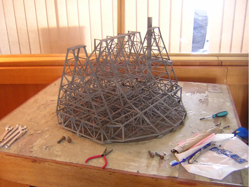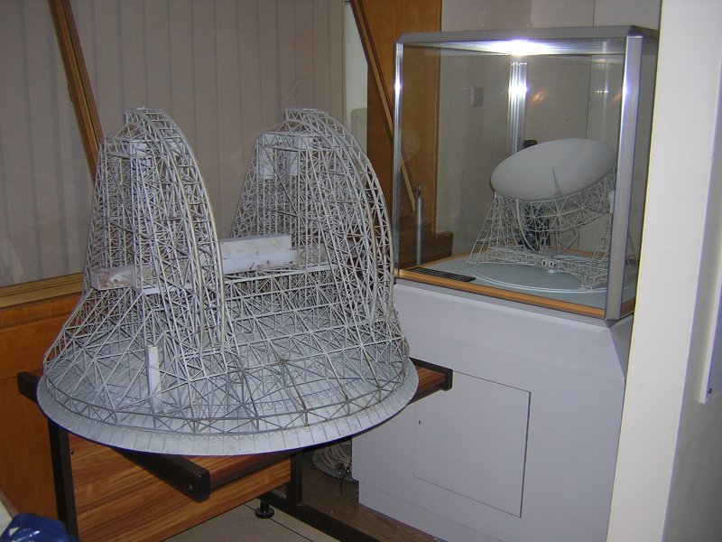 One such telescope was the Mark V, a proposed radio telescope which would have been 400-ft in diameter (for comparison, the Lovell is a mere 250-feet accross). This telescope was to be situated in a valley at Meifod in Wales but in the end it was never constructed. The firm of Husband and Co., the consulting engineers who worked closely with Lovell to design and construct the other large telescopes, did build a scale model of the Mark V which in itself is an impressive piece of work. For some time the model has been sat in storage, but a group of us went to collect it a couple of weeks ago.