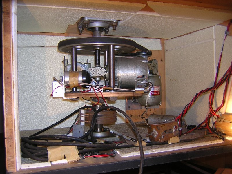 It's in a bit of a sorry state, covered in dust and pine needles (no idea where they came from!) and a lot of the brass "girders" have come loose over the years. Over a weekend I started to clean it up, collecting as many loose bits as I could find and cleaning them up so they could be soldered back on. It really is an impressive piece of work, very detailed and must have taken an age to complete. After so many years of neglect a lot of the joints are now very fragile and the whole base structure looks in danger of collapse. The quadrupod which would have held the receivers has collapsed already and needs some patience to stick back together. The bowl itself is not in bad condition, apart from being absolutely filthy! When I opened the wooden box under the base I had quite a suprise - the model was driven! There was a complete drive system in there, complete with a simple lever system which would have allowed you to control the direction of motion.