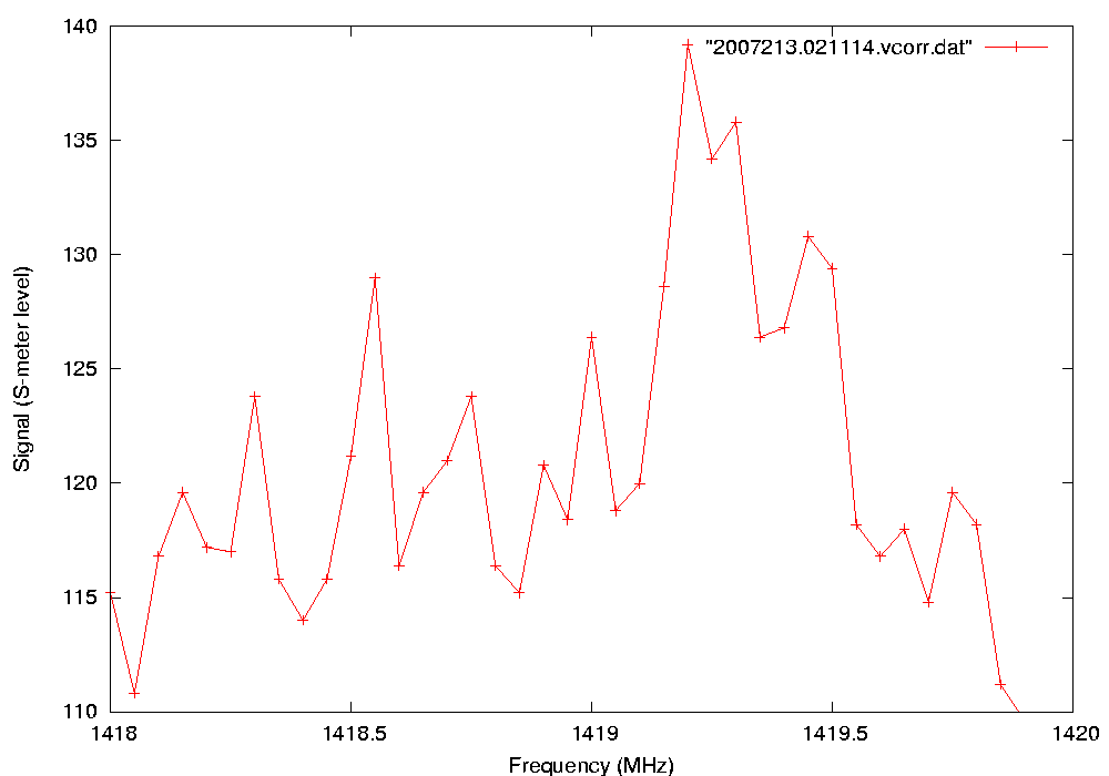The plot below shows one of the sythesised spectra taken with this equipment earlier. The signal due to hydrogen in the Galactic plane is the higher points around 1419.25 to 1419.50 MHz. (Honest. It looks far more obvious on the spectrum analyser which is also sampling the signal, but then that is a piece of equipment which was designed for that purpose...)