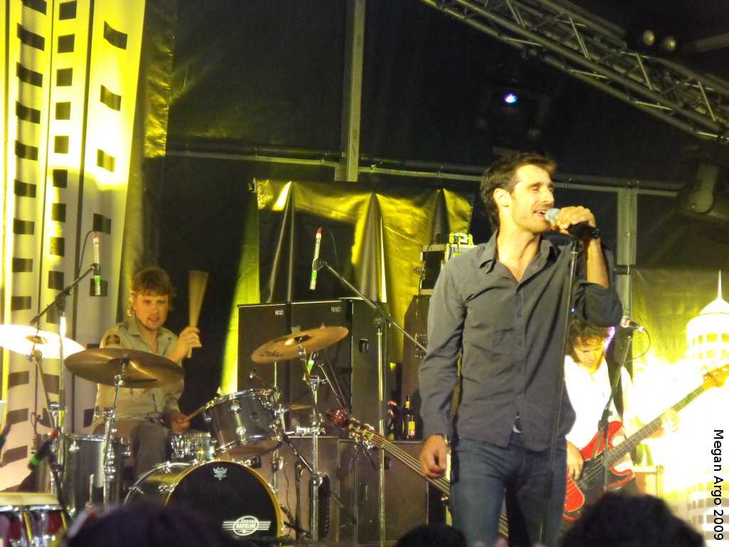 The Cat Empire, Fremantle, March 5th 2009. Left: the band on stage. Centre: Felix Riebl. Right: crazy fans. CREDIT: Megan