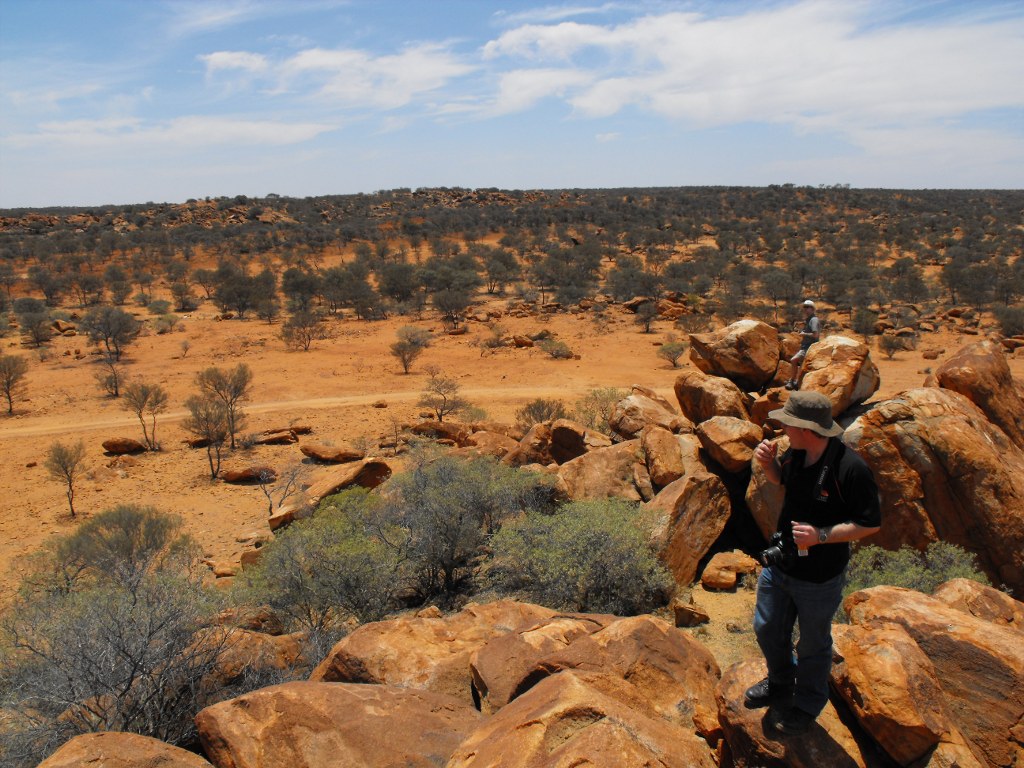 We left Yulga Jinna mid-morning and, after stopping a few times along the way to look at interesting things, arrived in Meekatharra around lunchtime. The town has a lookout perched on a spoil heap overlooking the town - it's an area with a long history of gold prospecting so there are mines of all shapes and sizes from small one-man operations to massive commercial pits, the heap on which the lookout is built is from one such pit. After calling in at the district high school to check the plan for the evening's viewing night, we explored the area. To the West of town is the airport, a Royal Flying Doctor base and weather station, and to the East is an area known as the Granites: a collection of boulder heaps scattered about the mulga bushes. It's pretty spectacular, and a popular spot for picnics in the past. Following the return of the local troops from the Second World War, a large picnic was held there and the area became known as Peace Gorge.
