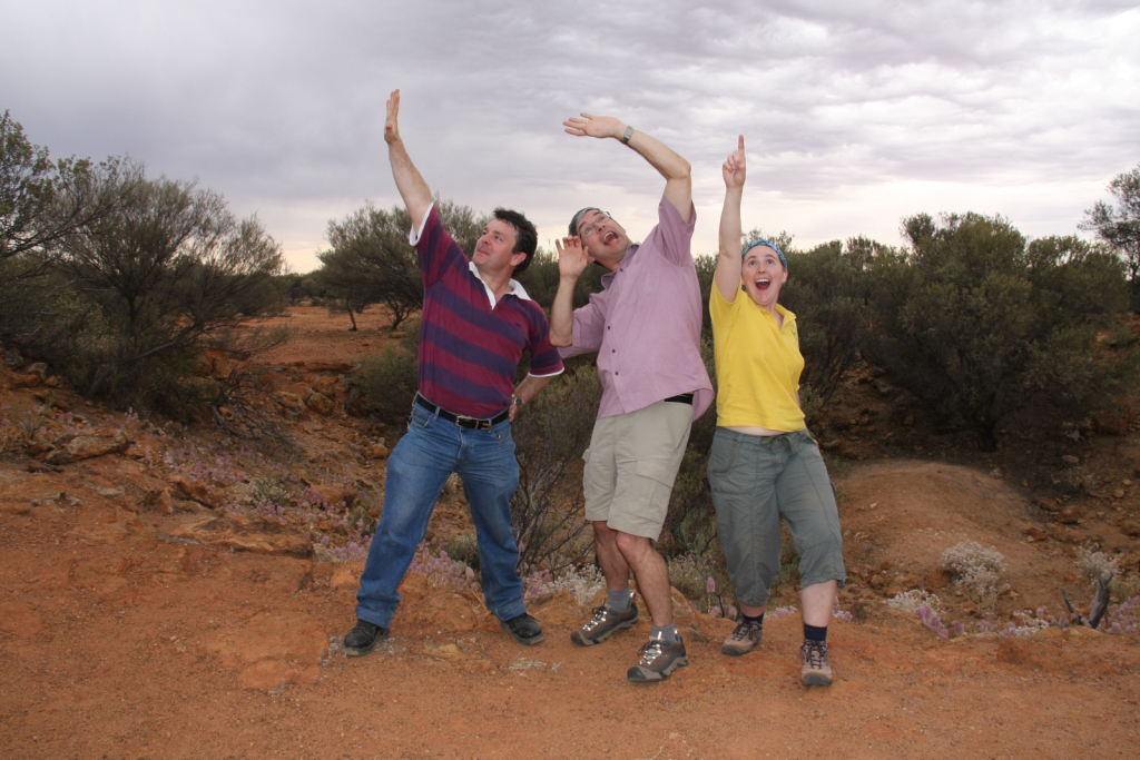 Dalgaranga crater is the smallest authenticated crater in Australia and is either 21-m or 25-m in diameter, depending on which sign you read. It was discovered in 1920 by an aboriginal stockman named Billy Seward who almost rode straight into it during a muster on Dalgaranga station. It's a few kilometres from the main dirt road, but it well signposted by the Shire of Yalgoo. We had lunch there, John made a couple of full-dome panoramas with his camera, and we staged a very silly group photograph. Miles and miles from anywhere, it was so quiet. The sky was very menacing and we could see rain towards the coast - in outback WA you can see the weather coming from a long way off. There were some impressive lightening strikes and, with nothing to absorb the sound, the thunder echoed around the landscape for quite some time.